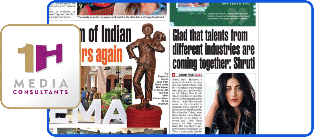 1H Media Consultants is a Mumbai based Media consultant and Public Relations firm specializing in media led publicity and communication services for Content Creators, Celebrities, Film Studios and all entities connected to the entertainment industry. We also cater to conceiving and executing the publicity strategy for Film Festivals, Information and Broadcasting Ministry (GOI) supported Events and Corporate Organizations.